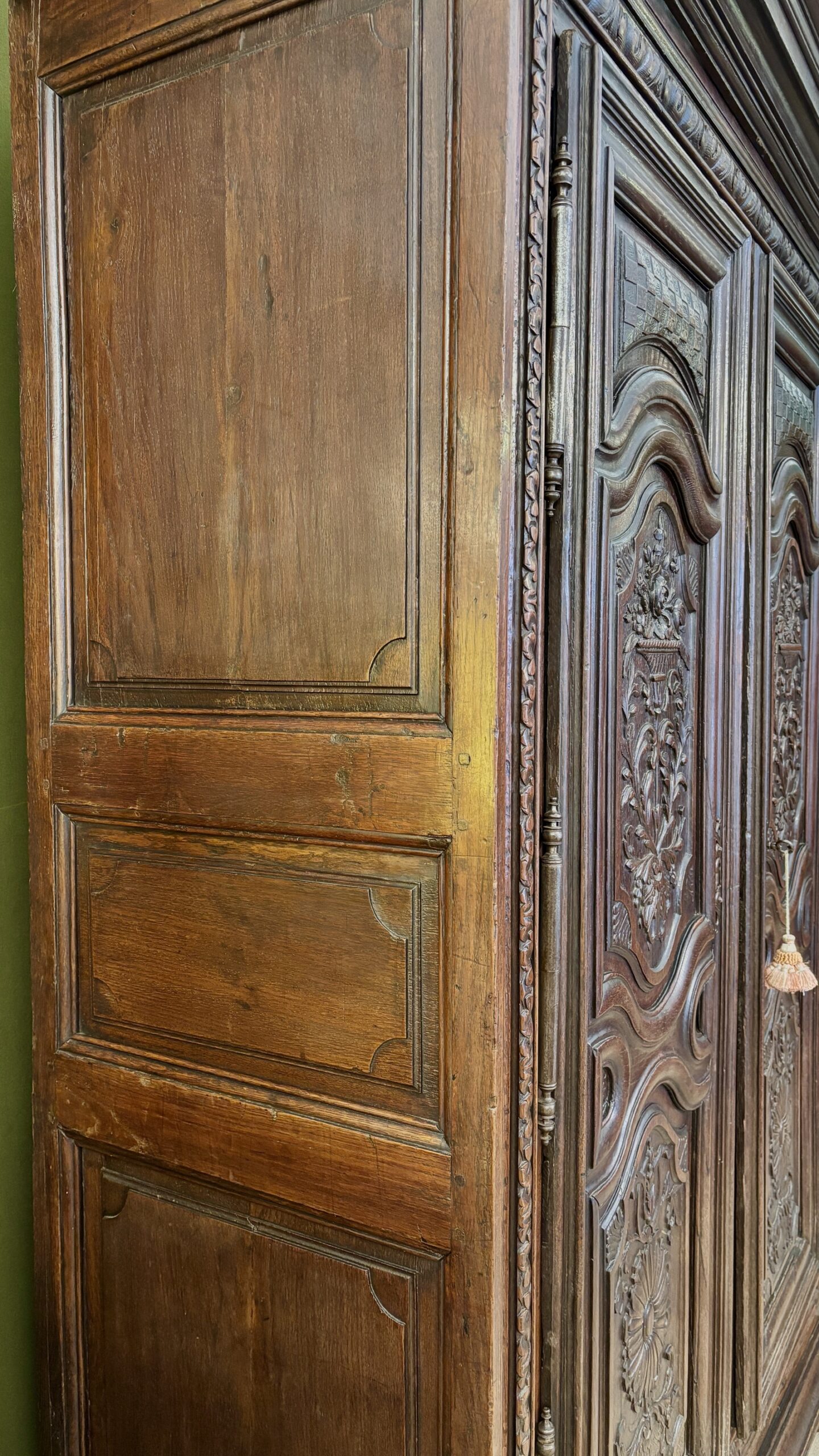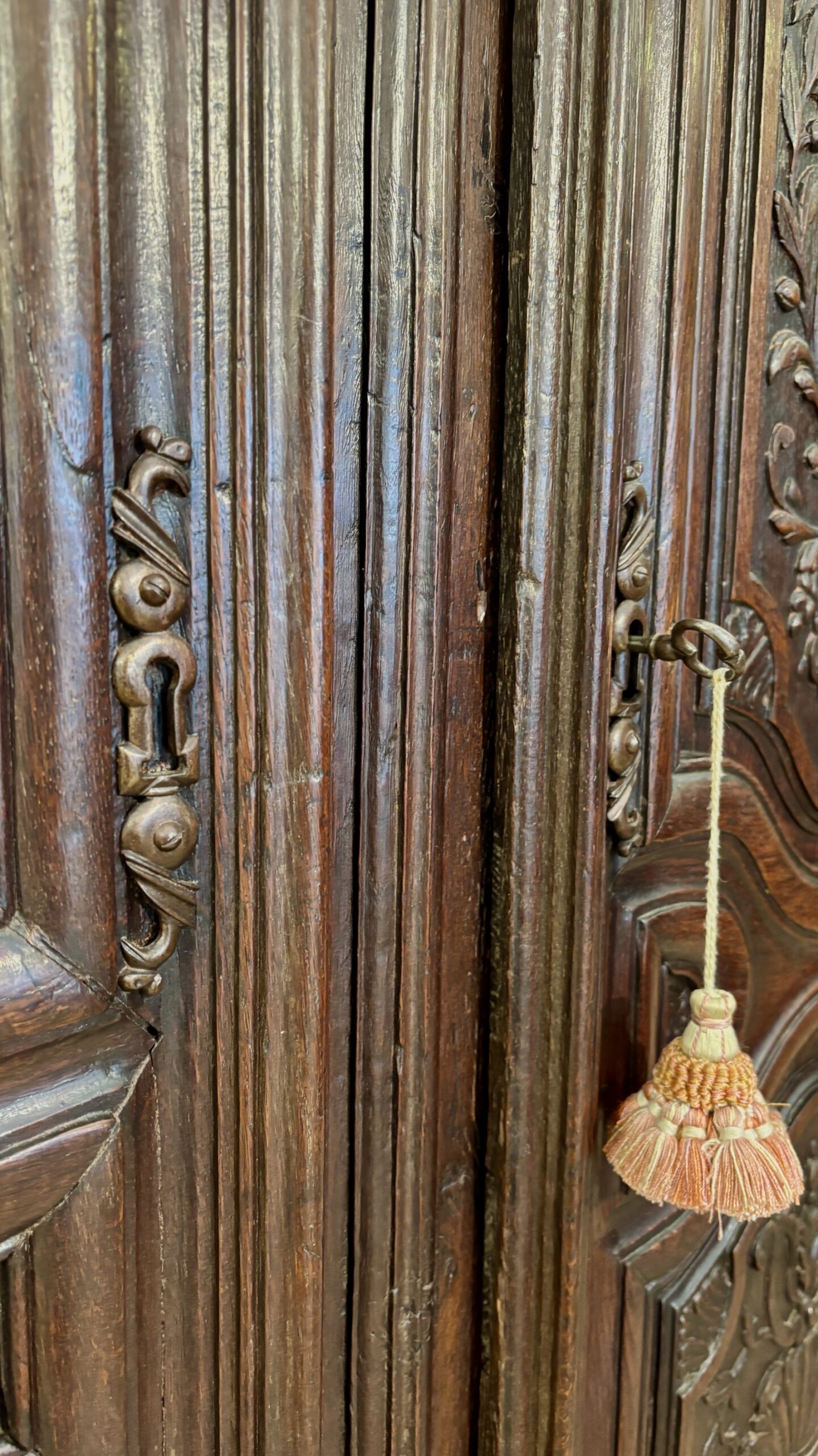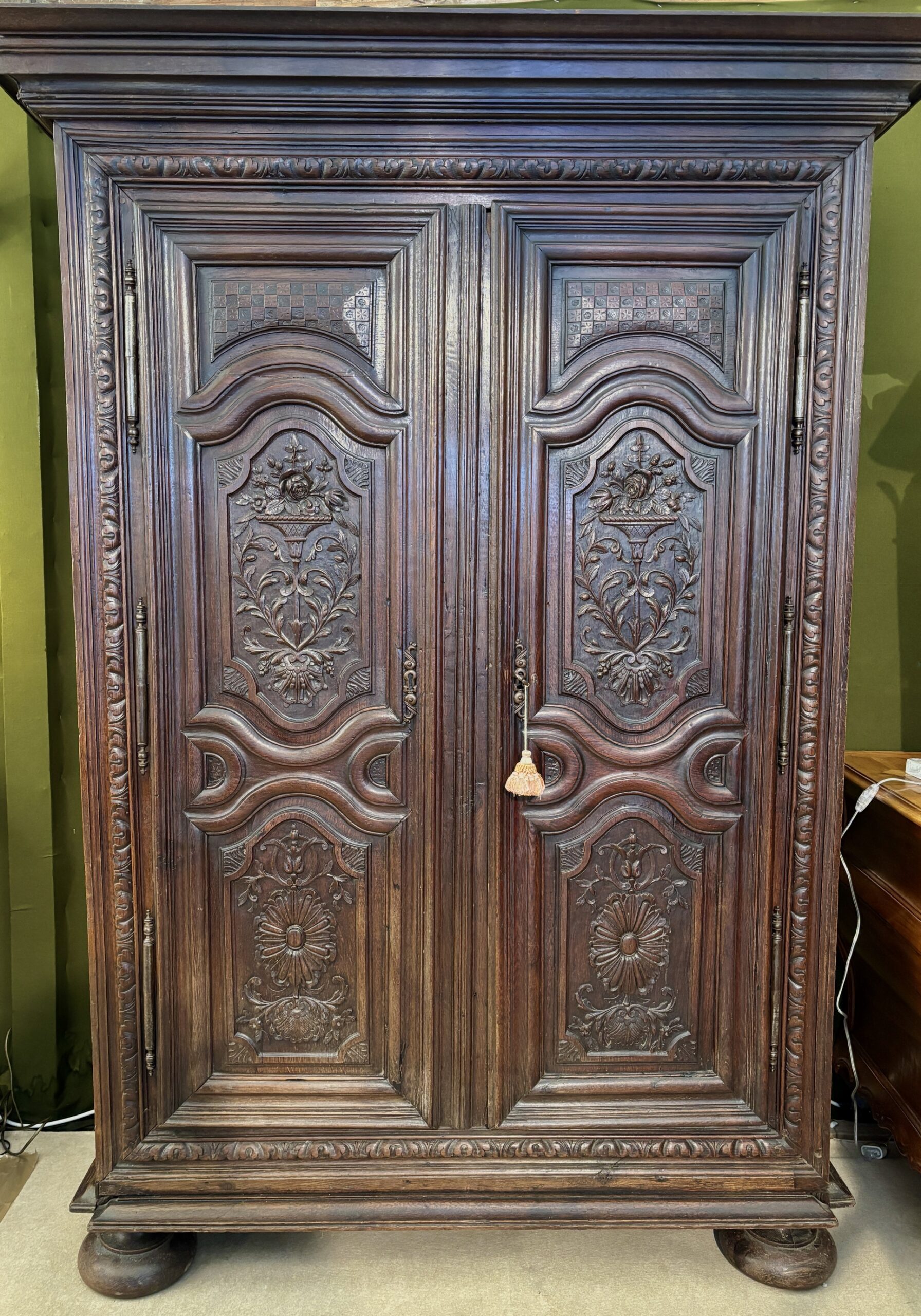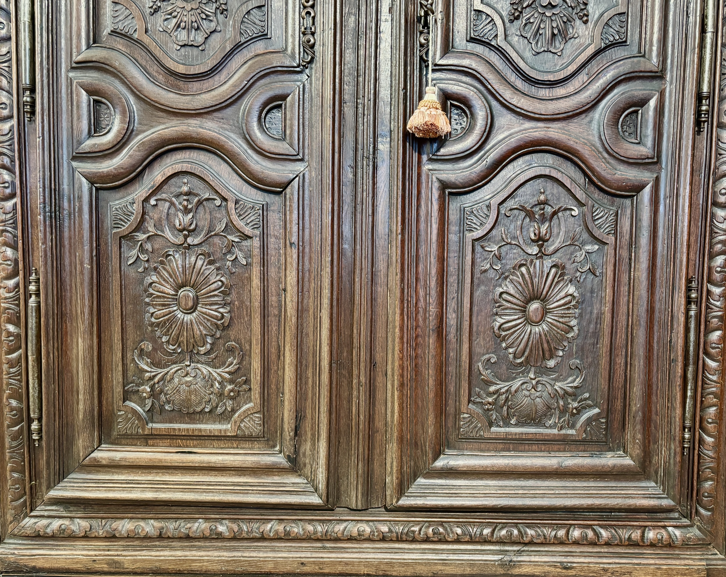 This charming little wardrobe proves Adolf Loos wrong: ornamentation is not a crime! Just look at its doors, richly carved with delightful and delicate motifs, its ornate ironwork, its frame adorned with a frieze of heart-shaped motifs, its dainty ball feet, and its artfully molded cornice. Everything here employs the vocabulary of a masterful Louis XIV style, on this charming wardrobe of modest size, perfectly suited to small spaces. This contemporary wardrobe from the end of Louis XIV’s reign is in very good condition.
