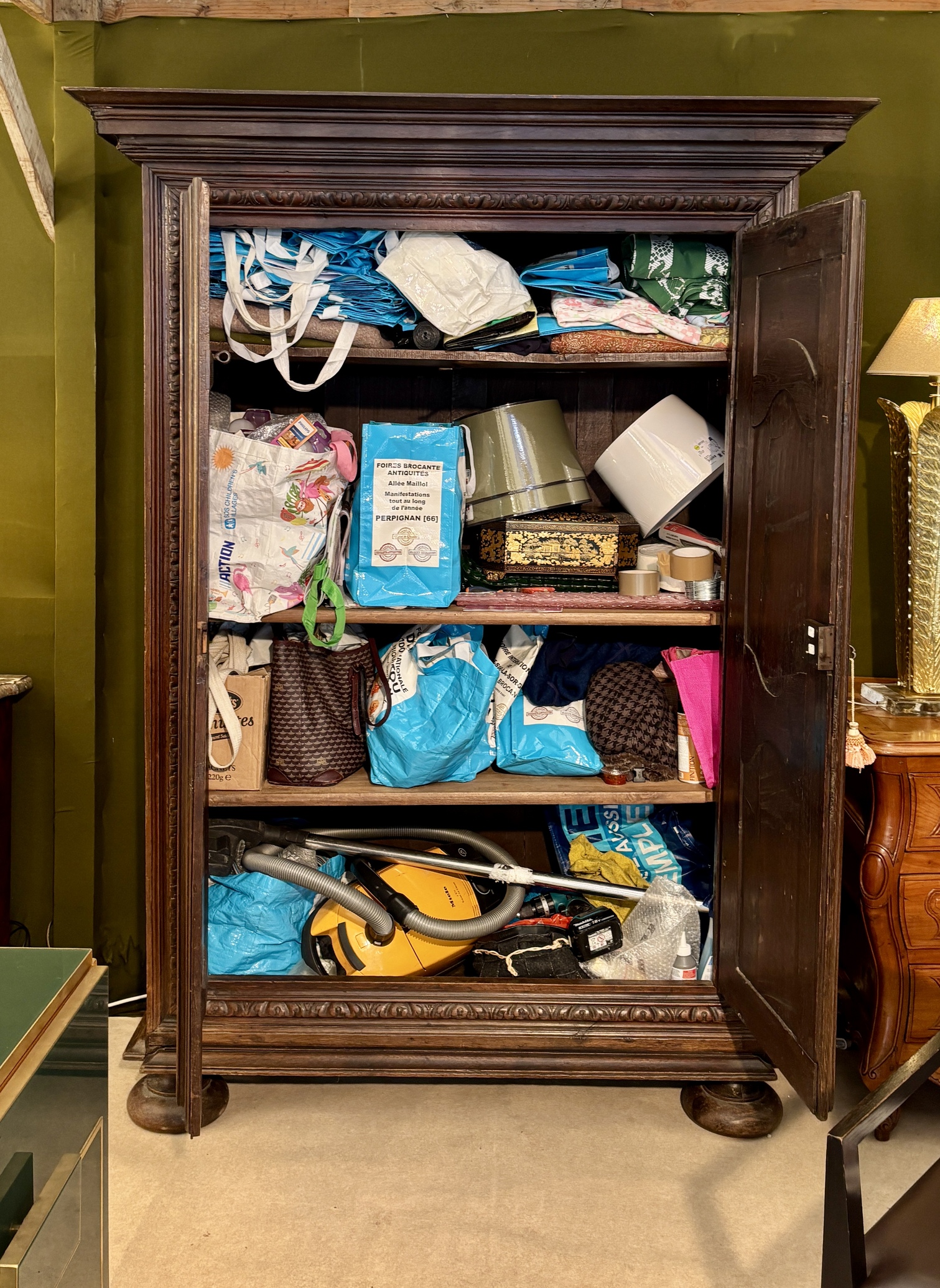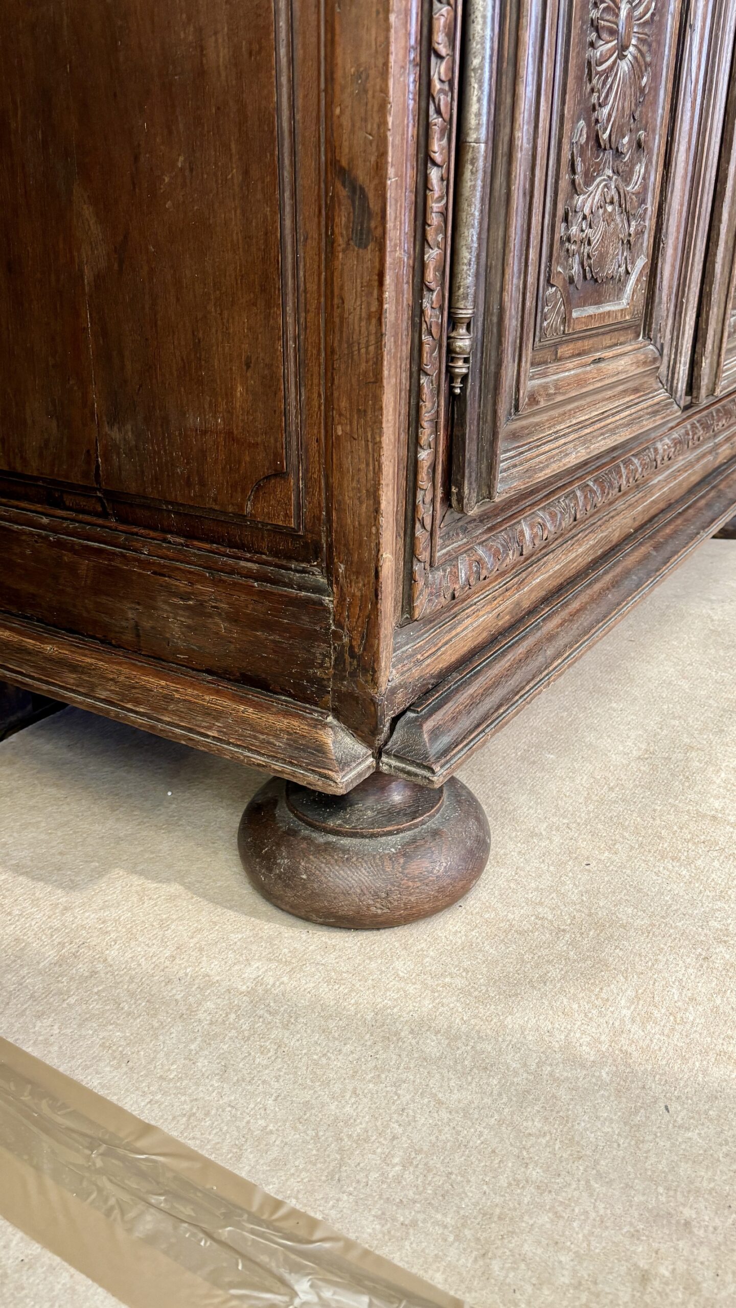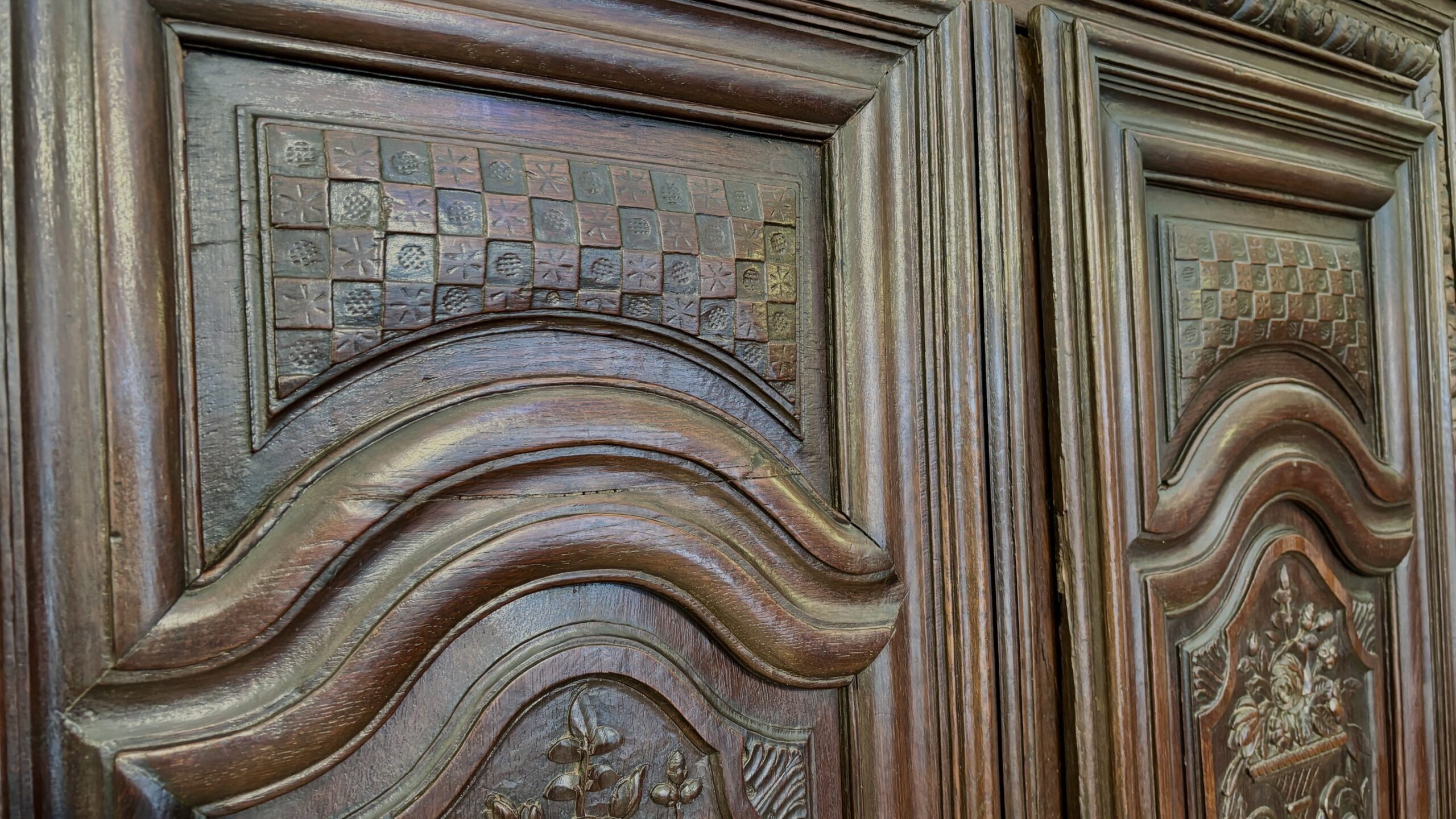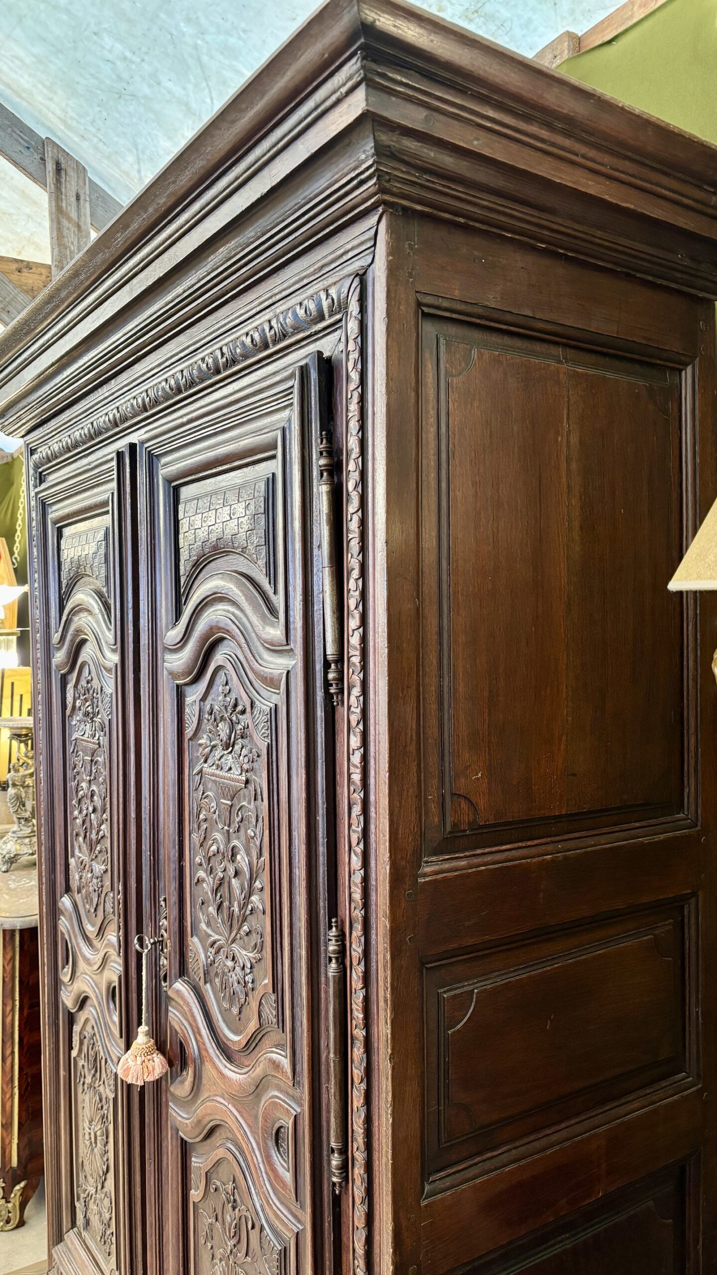 This charming little wardrobe proves Adolf Loos wrong: ornamentation is not a crime! Just look at its doors, richly carved with delightful and delicate motifs, its ornate ironwork, its frame adorned with a frieze of heart-shaped motifs, its dainty ball feet, and its artfully molded cornice. Everything here employs the vocabulary of a masterful Louis XIV style, on this charming wardrobe of modest size, perfectly suited to small spaces. This contemporary wardrobe from the end of Louis XIV’s reign is in very good condition.