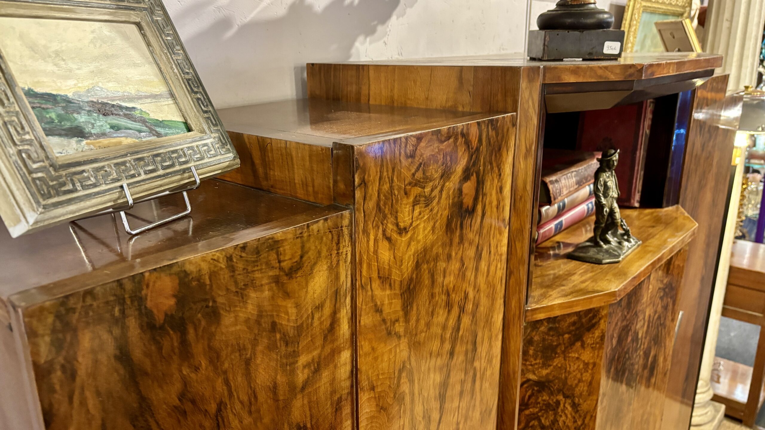 Dessinée dans un style Art Déco Odéon, empruntant ses lignes à l’architecture des buildings contemporains de son époque, cette armoire ouvre à trois portes et présente une niche centrale. Ses lignes strictes et droites sont adoucies par le placage en loupe de noyer et ce dernier est animé par les poignées chromées. L’ensemble est en parfait état et peut servir aussi bien dans une chambre, un bureau ou une entrée.