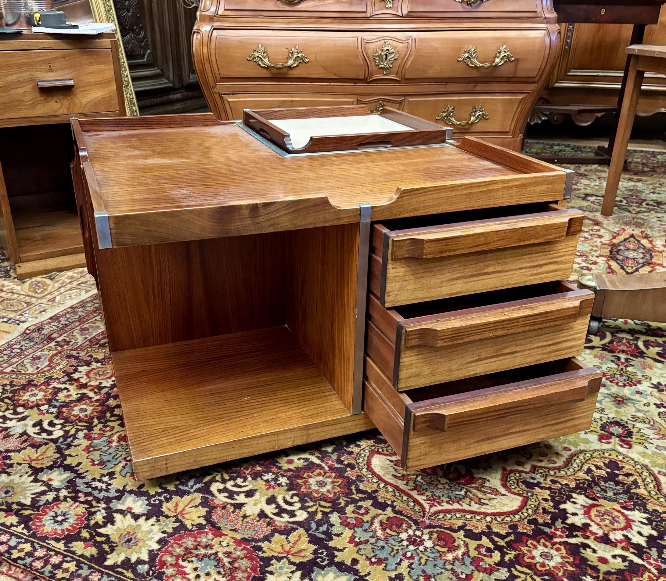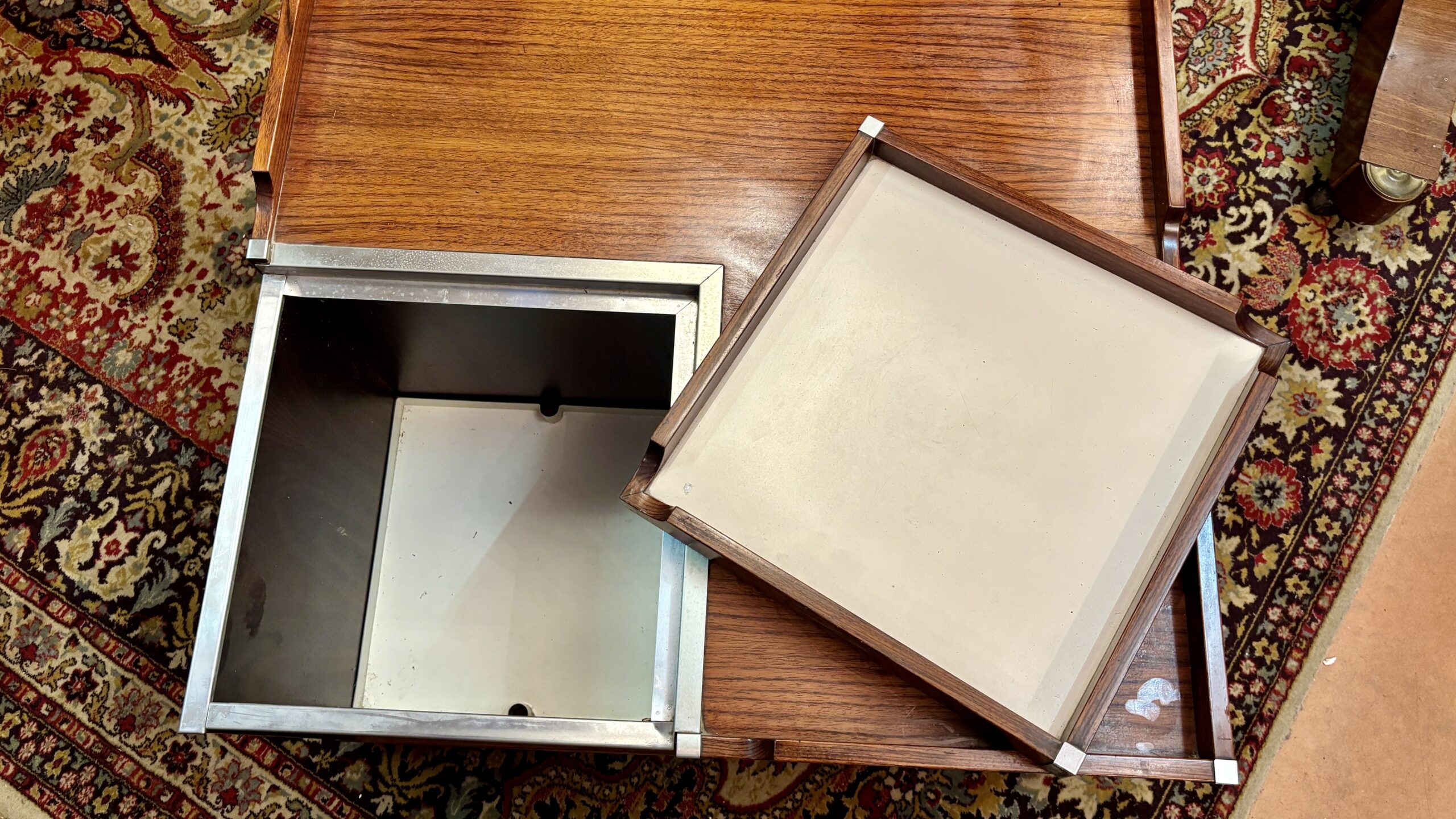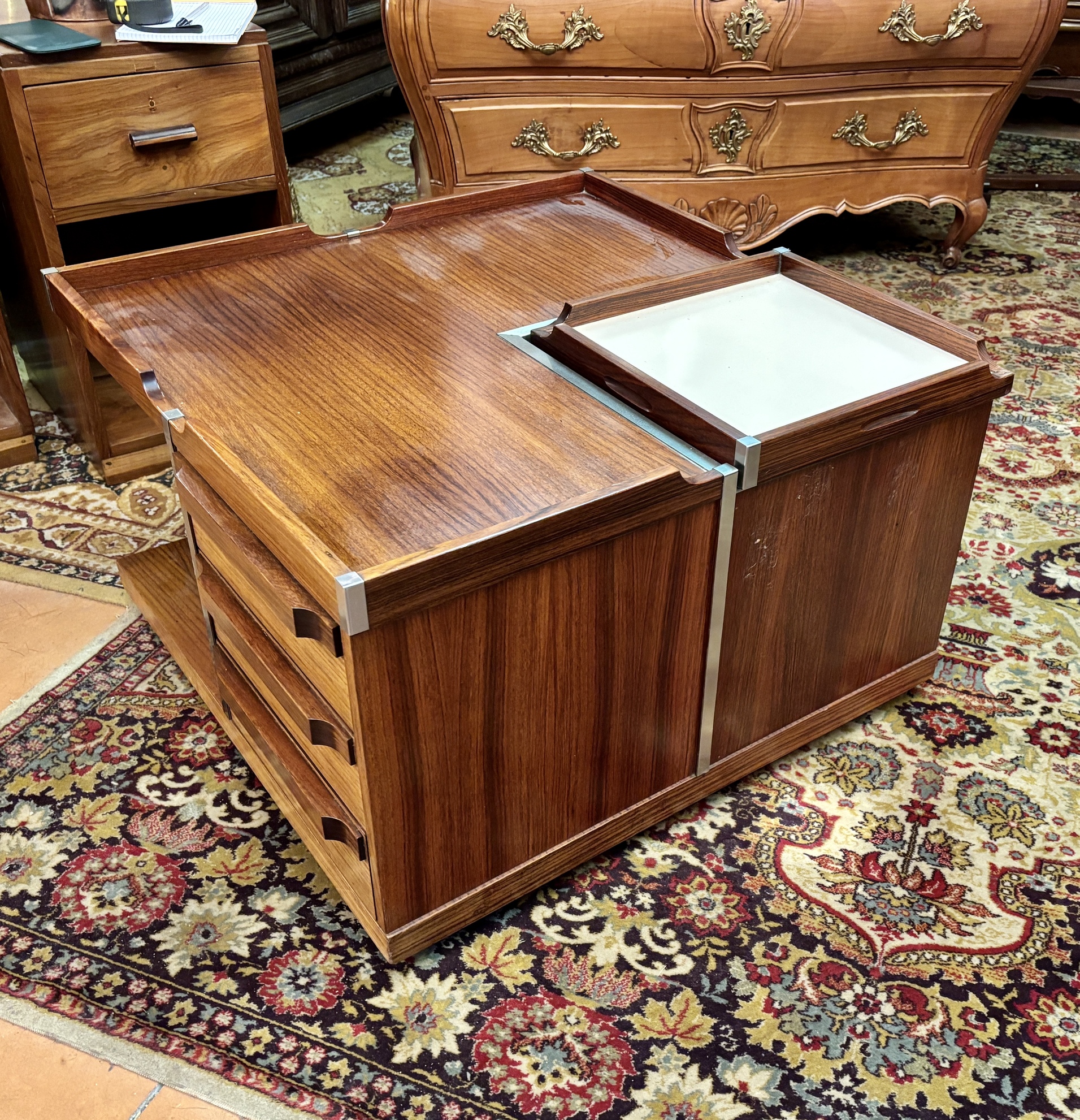 Signature incontournable du mobilier design italien, la Galerie Bernini présente à son catalogue les plus grands noms du design de la péninsule, tels que Carlo Scarpa, Gianfranco Frattini ou Angelo Mangiarotti. Cette table basse s’inscrit dans la ligne et le goût du designer Gianfranco Frattini. Modulaire, elle présente différents aménagements dont un plateau de service, un placard, des tiroirs et niches de rangement. En très bon état, cette table basse incarne à elle seule le goût des années 1960.