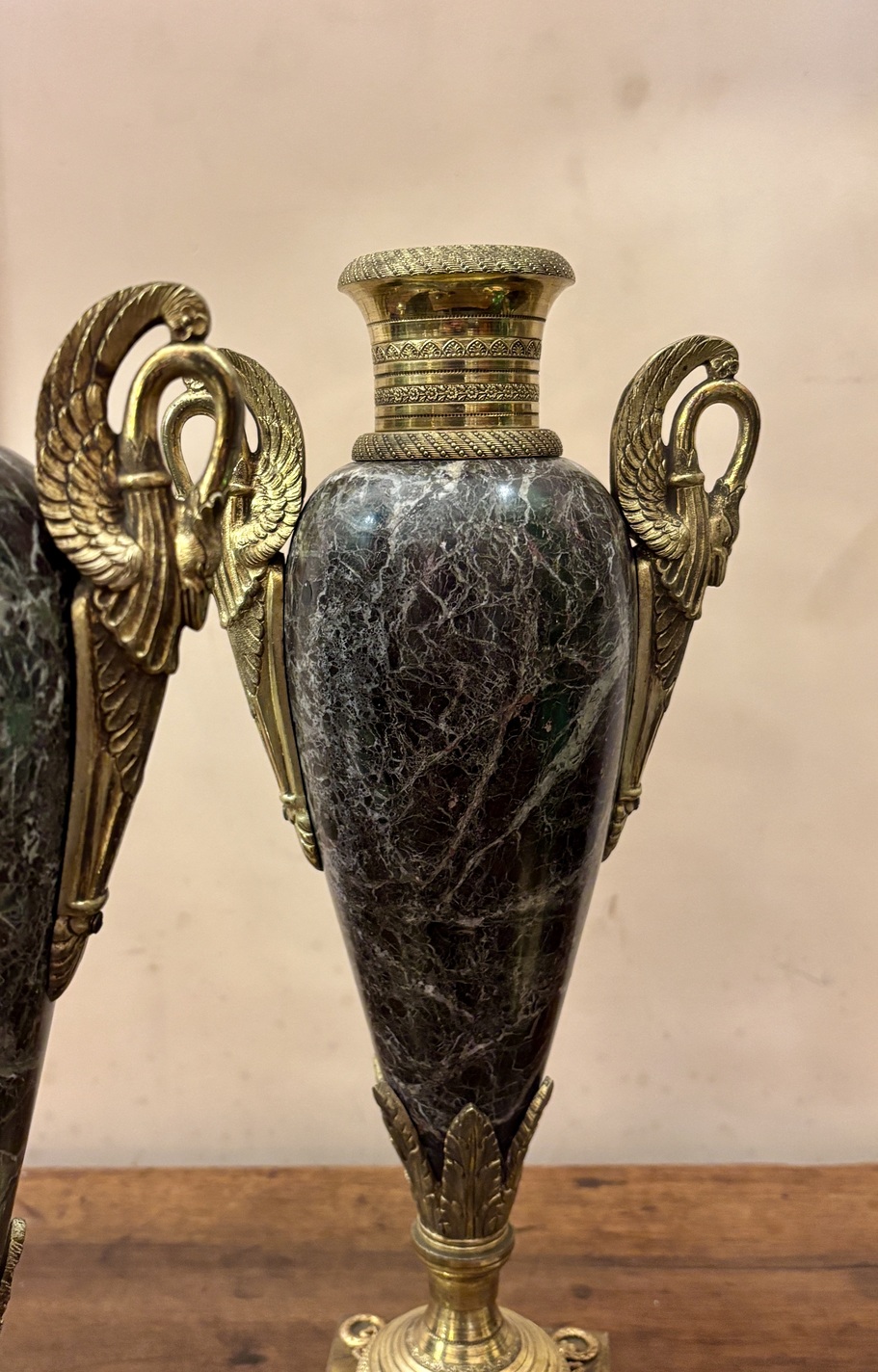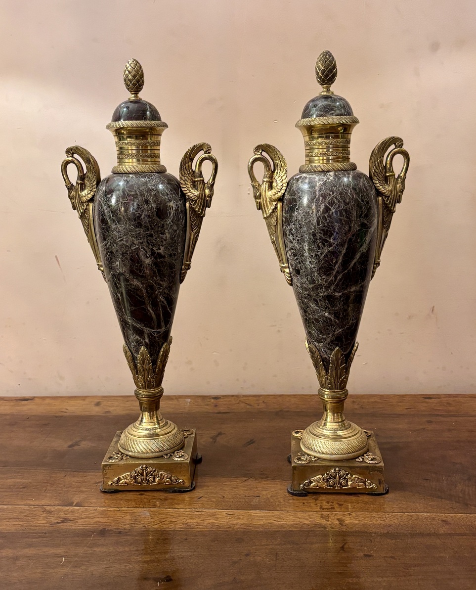 Taillées dans un marbre gris richement veiné, chacune de ces urnes néoclassiques est montée en bronze doré et dressée sur un socle du même métal. Chaque couvercle est surmonté d’une pomme de pin, les cols finement ciselé et les anses zoomorphes imitent des cygnes aux ailes relevés. L’ensemble est en parfait état.